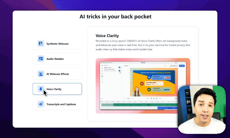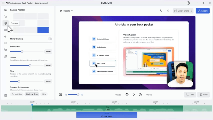 Control how your webcam behaves during zoom in CANVID. Learn how to keep your camera visible, shrink it, or hide it for cleaner, more professional screen recordings.