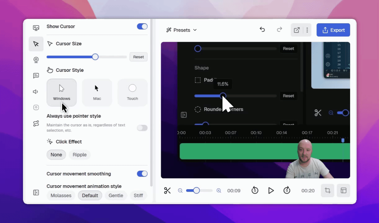 The Cursor sidebar in the CANVID Editor offers a variety of customization options to match your content style and give your recordings a more polished, professional look.